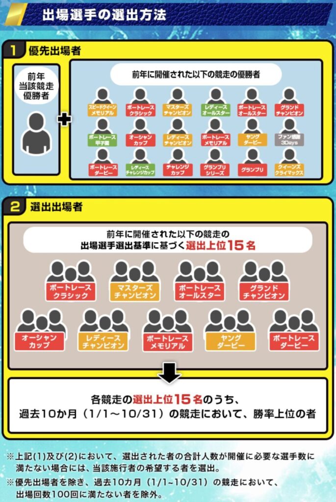 - 【優先出場者】前年の9つのSG競走(クラシック・オールスター・グランドチャンピオン・オーシャンカップ・メモリアル・ダービー・チャレンジカップ・グランプリ・グランプリシリーズ)優勝者