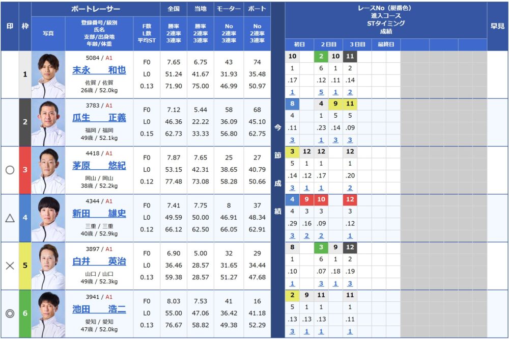 - 成績対象期間内でのSG・プレミアムG1における出場選出基準に基づく勝率上位選手