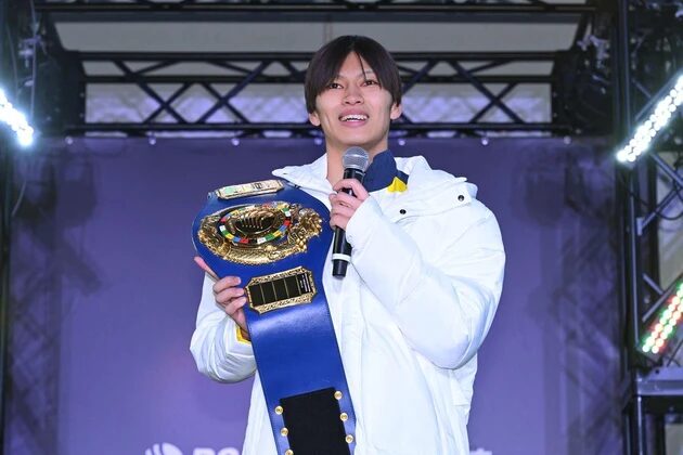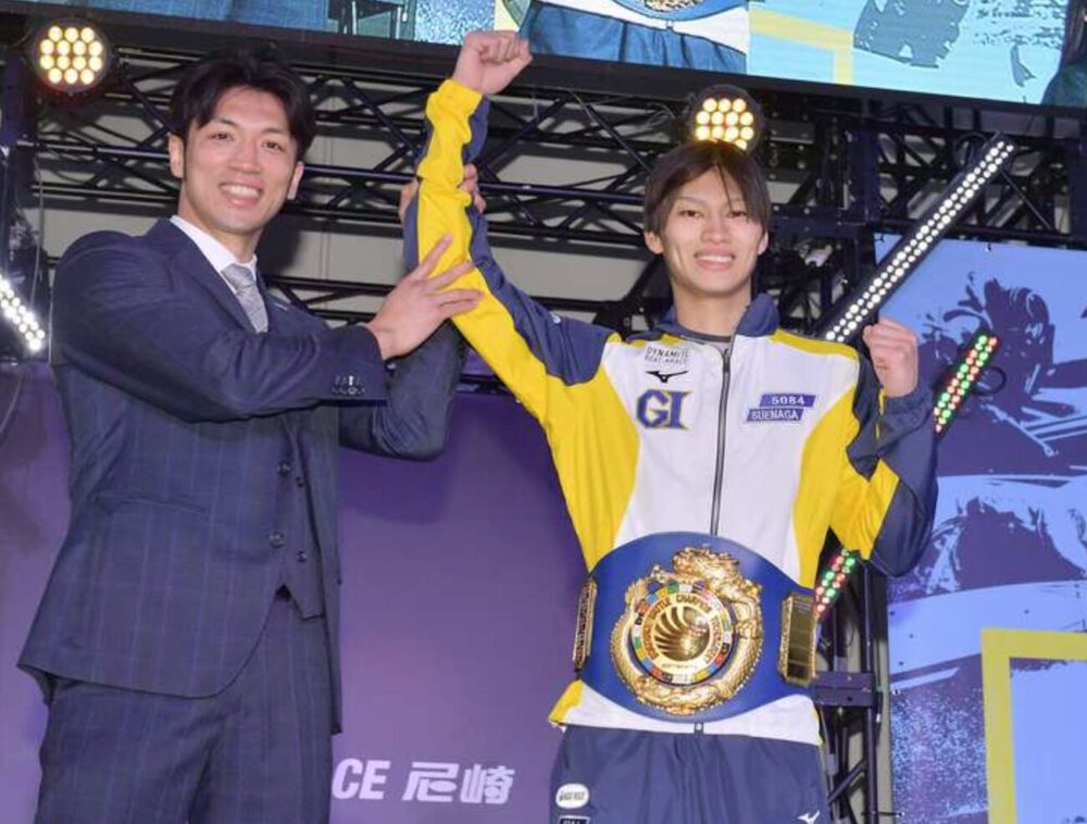 優勝した1号艇・末永和也はプレゼンターの村田諒太からチャンピオンベルトを装着された=尼崎市・ボートレース尼崎 最年少の新チャンプ誕生だ!! 尼崎ボートの「プレミアムGⅠ第7回BBCトーナメント」は25日、第12Rで決勝戦が行われ、末永和也(26)=佐賀=が逃げ快勝で大会初制覇。4度目のGⅠVを飾り、来春に地元からつで開催されるSGボートレースクラシックの出場権を獲得した。史上初の連覇を狙った茅原悠紀(岡山)は2着。3着には新田雄史(三重)が入った。
