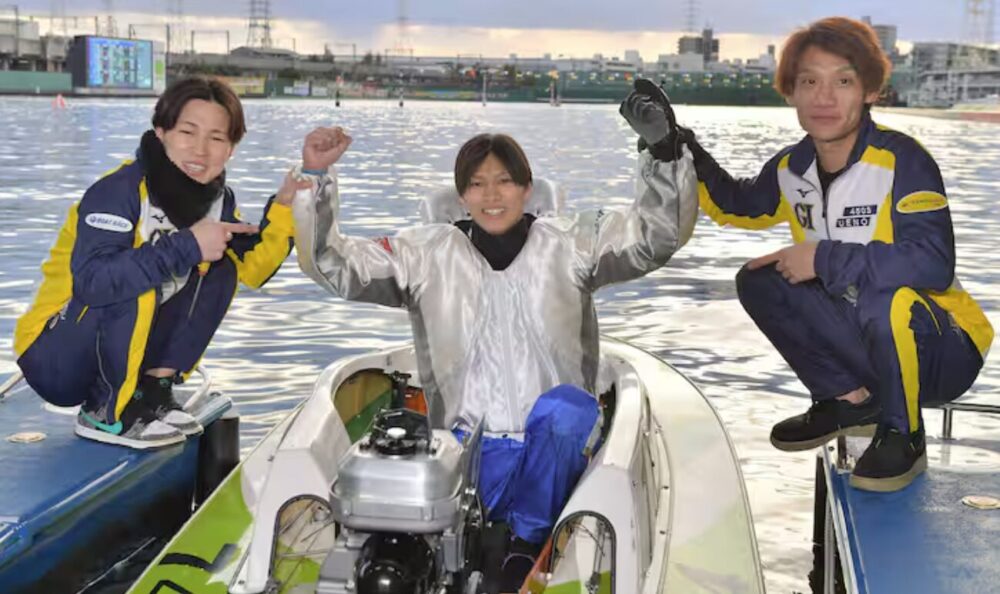 優勝した1号艇・末永和也(中央)。左は常住蓮、右は上野真之介=尼崎市・ボートレース尼崎 「この大会は運が大きいと思うんですけど、あのメンバーで勝ててすごくうれしく思います。3カドには全く気づかなかったです。『あぁ、追い風だ』と、スタートのことばかり考えていて見ていなかったです」