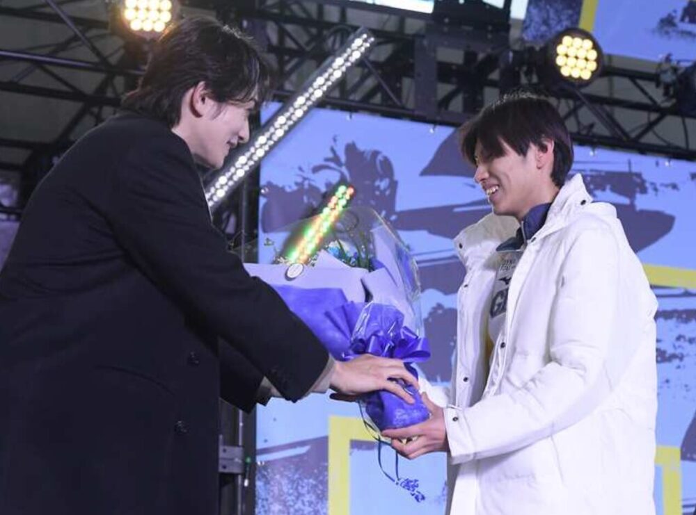 優勝した1号艇・末永和也は俳優の町田啓太から花束を贈られる=尼崎市・ボートレース尼崎 安定板装着に加え、節間通しての向かい風基調から追い風に変わる難しい条件下で、大会連覇を狙い展示から3カドに引いていた茅原に気づかぬほど全集中。6強全員SG覇者、ライバル5人で計31冠と百戦錬磨の先輩相手に、コンマ14のトップSを決めて先マイ一気と、勝負強さを示した。