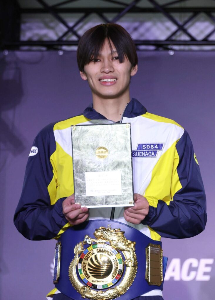 チャンピオンベルトを巻きメダル入り記念盾を手に笑顔の末永和也 4日間の激熱トーナメントバトルを制した末永和也(26=佐賀)がイン速攻で7代目のチャンピオンに輝いた。2着は茅原悠紀、3着は新田雄史。これがプレミアムG1初制覇。優勝賞金1300万円と副賞の高級車BMWを獲得した。来年3月の地元からつSGクラシック優先出走権、来年のBBCトーナメント優先出場権も手に入れた。