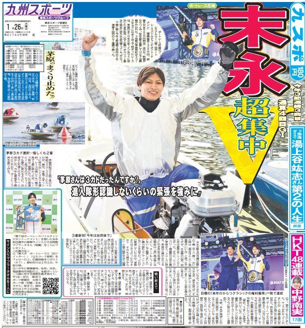 「真之介さんにプロペラとかをずっと教えてもらってきて、そのおかげがすごく大きいです。あとはサダとレンが近くにいて、いいライバルとして切磋琢磨できる仲間がいるのが強みです」と師匠の上野真之介の助言や、養成所チャンプトリオで佐賀支部後輩の定松勇樹、常住蓮の存在も励みに新年早々の大仕事を達成。特に「からつクラシックの権利を取れておめでとうと言ったんですけど、僕も絶対にいきたくて頑張ろうと思った」と直前の芦屋GⅠ73周年を制した定松に刺激を受け、自身も来春の地元からつSGクラシック出場権を獲得した。