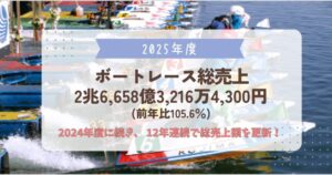 ボートレースの2025年度(2025年4月1日~2026年3月31日)の総売り上げは2兆6,658億3,216万4,300円で、前年度比は105.6%で5.1%上昇するとともに、売り上げ額は前年度よりも1,430億4,958万2,200円の増額。