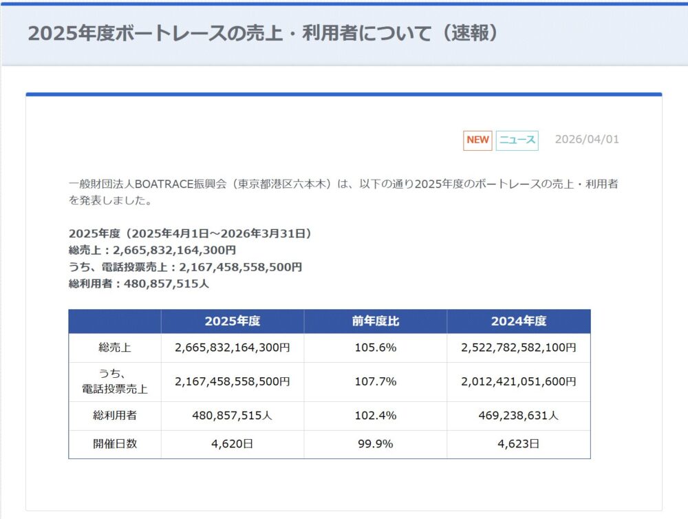 2026年4月1日、一般財団法人 BOATRACE振興会 は、年度末の2026年3月31日終了時点での2025年度のボートレースの売上・利用者(速報)を発表しました。