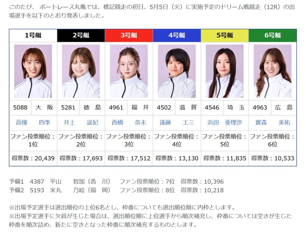 さらに、得票数の上位選手がドリーム戦(初日の12レース)に選抜されるため、すでに優先出場権を有する選手もファン投票の対象になるのは、ボートレースファンにとって熱くなる理由でしょう。