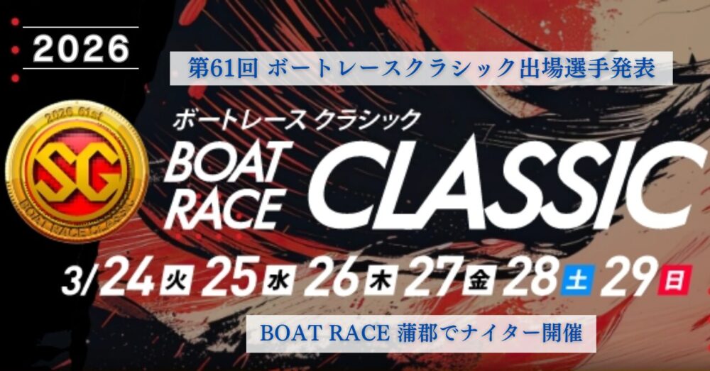 2026年1月5日、日本モーターボート競走会は「第61回 ボートレースクラシック」(2026年3月24日~29日・蒲郡)の出場選手を発表しました。選考期間内におけるSG・PG1・G2覇者など、錚々たるレーサーが集うだけあり、2026年のSG戦線の開幕戦らしいレベルの高いレースが予想されます。優勝賞金4,200万円を手にするのは誰か!?ボートレースクラシックの概要・歴代優勝者・第61回大会の出場選手について解説しています。 最新ニュース