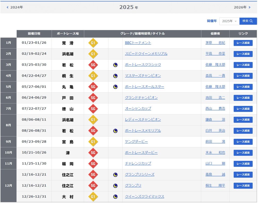 2025年における、SG競争の優勝賞金額は次のとおりです。