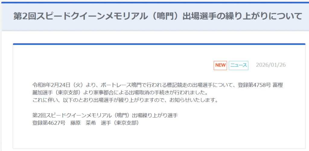 2026年1月26日、日本モーターボート競走会は「第2回 スピードクイーンメモリアル」(2026年2月24日~3月1日、鳴門)の出場選手の繰り上がりを発表しました。